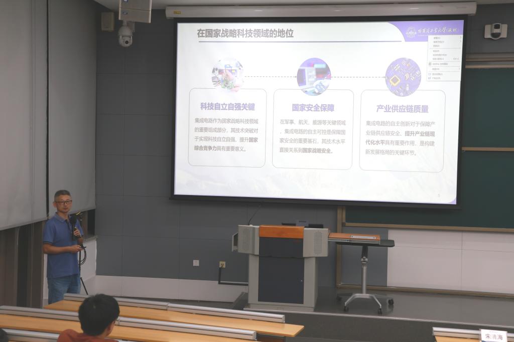 会议伊始,学院院长宋清海教授发表欢迎辞。他首先对新生们历经层层考核加入哈工大深圳表示祝贺,随后介绍了集成电路学院的成立背景、学院简介与人才培养方式。他结合亲身参加九三阅兵的震撼感受以及中央秘密党员杨度一生为国家求索的精神,勉励同学们胸怀家国,勇担使命,以青春之我、奋斗之我,将个人成长融入国家科技事业发展之中,为国家集成电路事业贡献力量。
